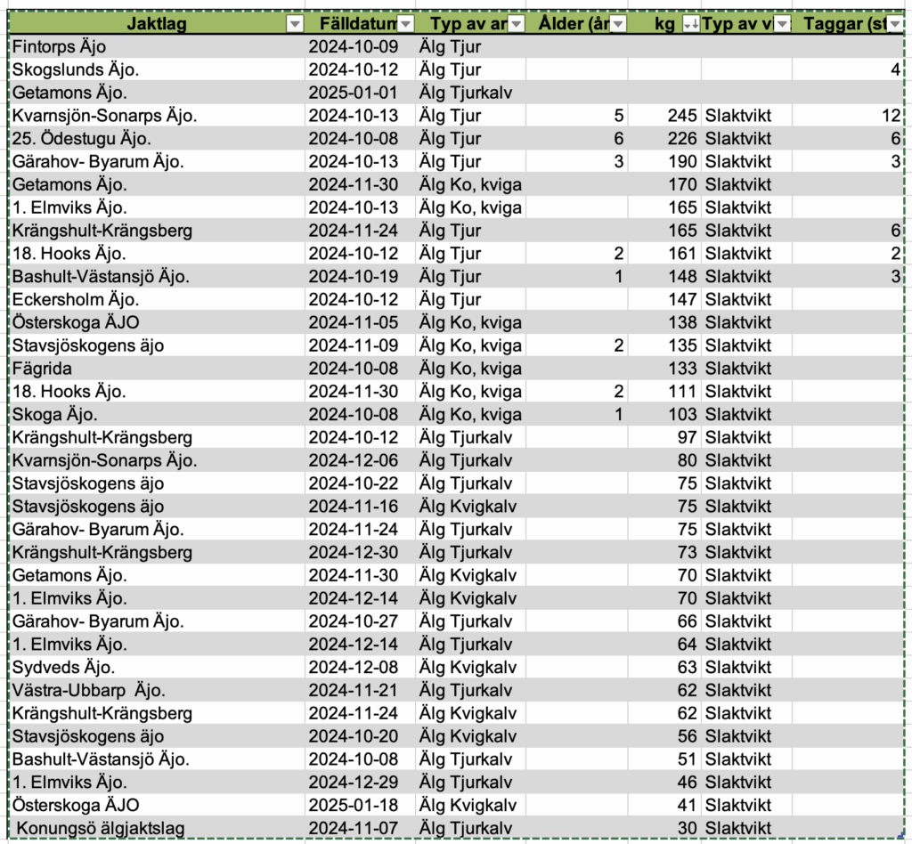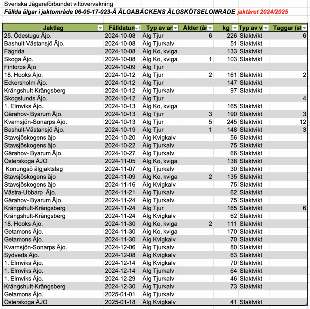 Fällda älgar i jaktområde ÄLGABÄCKENS ÄLGSKÖTSELOMRÅDE jaktåret 2024/2025