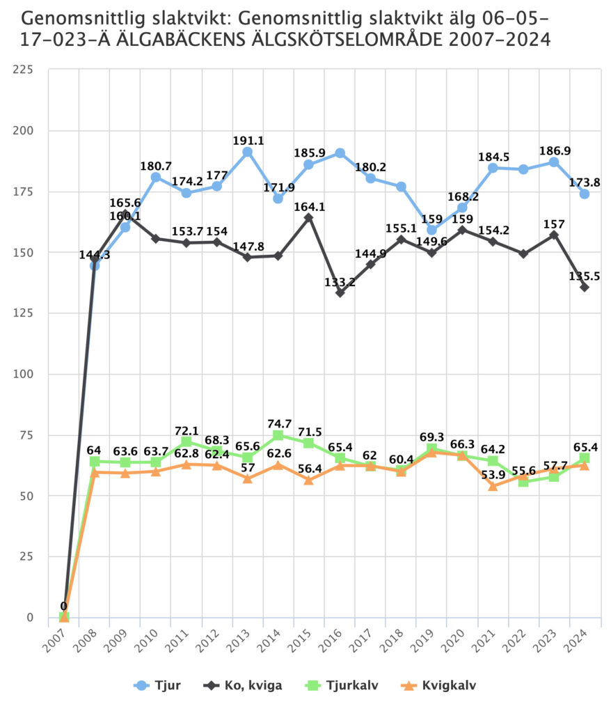 Fällda älgar i jaktområde ÄLGABÄCKENS ÄLGSKÖTSELOMRÅDE jaktåret 2024/2025